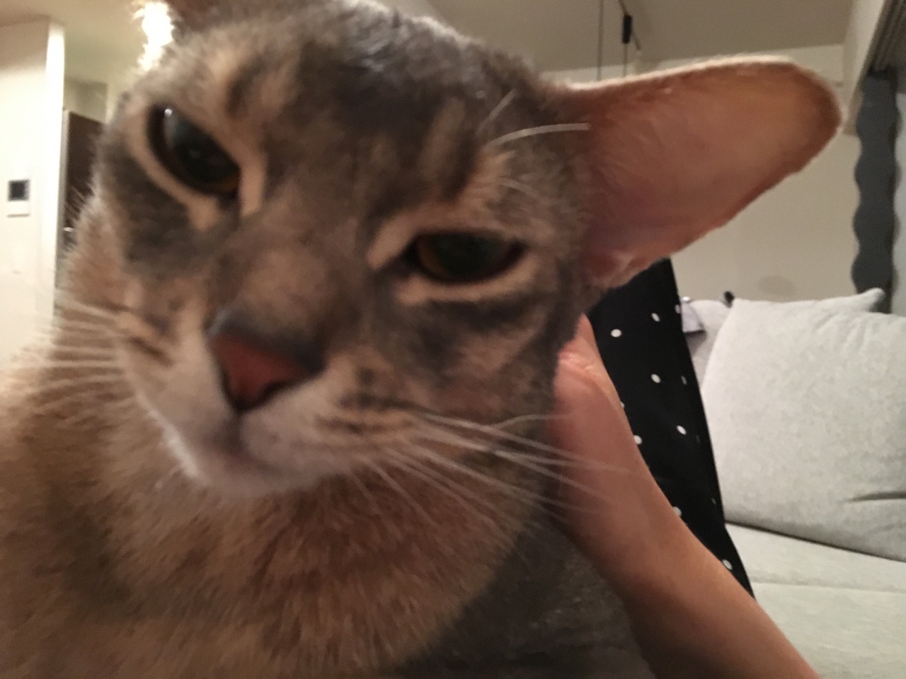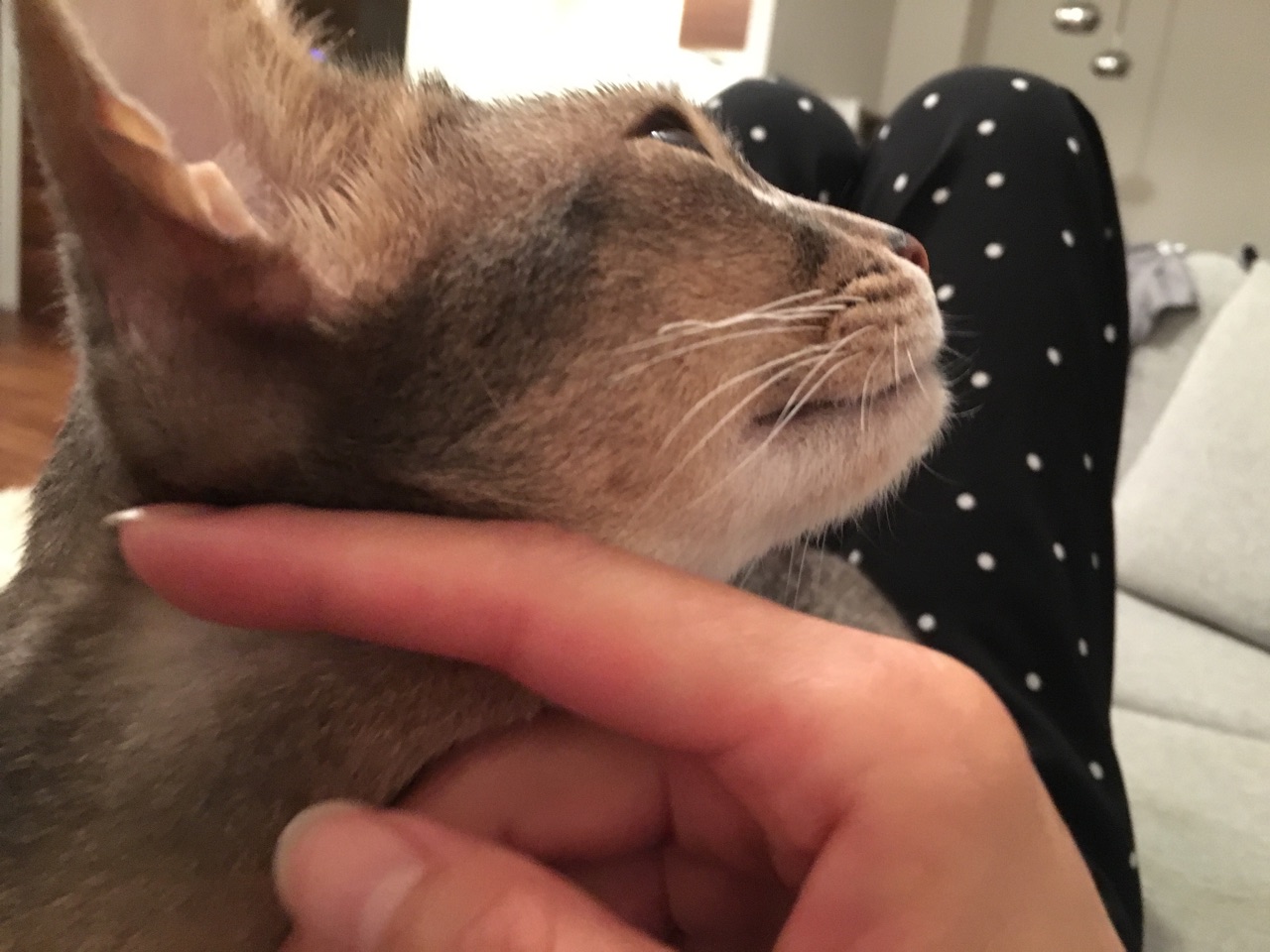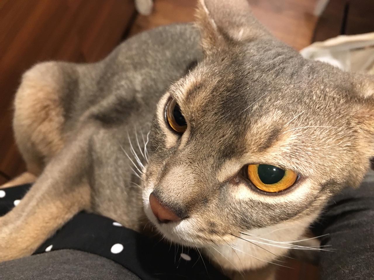 足元にやってきて、背伸びして、前足を伸ばしてもたれかかってきて