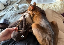 膝に無理矢理乗ってくるりすたんと編み物 2026年02月28日 ソファーで編み物をしていると、りすが毛糸をかき分けてお膝の上に乗ってきた。りすは、お膝に乗るのが好き。たとえ作業中でも、構わず乗ってくる。なので、毛布をかけてその上で編み物をした。りすを膝に乗せて編み物。幸せ♡しばらくすると、寝た。毛糸やコードが背中に当