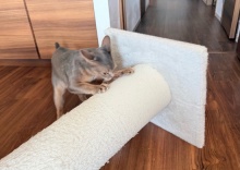 爪とぎを倒して使う技を見つけた 2026年03月01日 わか坊が、朝から荒ぶって爪とぎポールを倒した。そして、荒ぶりついでにしがみついてた。イカ耳で倒れた爪とぎを抱え込んでいる。征服したつもりかもしれない。その時、何かに気付いたようだ。この部分。爪とぎの縄が削れてなくて比較的新しい。そのことに気付いた坊は、新