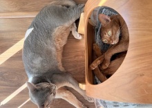 宇宙船の中と外、お昼寝の場所取り合戦 2026年01月25日 昼下がり、宇宙船の中でお昼寝を決め込むひめちゃんと、その出口に居座るわか坊。わか坊も宇宙船に入りたかったけど、先客がいたのでここにいるんでしょう。\そんな所で見張ってたって、ひめちゃん宇宙船は譲らないけど?/\お姉ちゃん早く出ろでち/宇宙船を巡る攻防。ひ