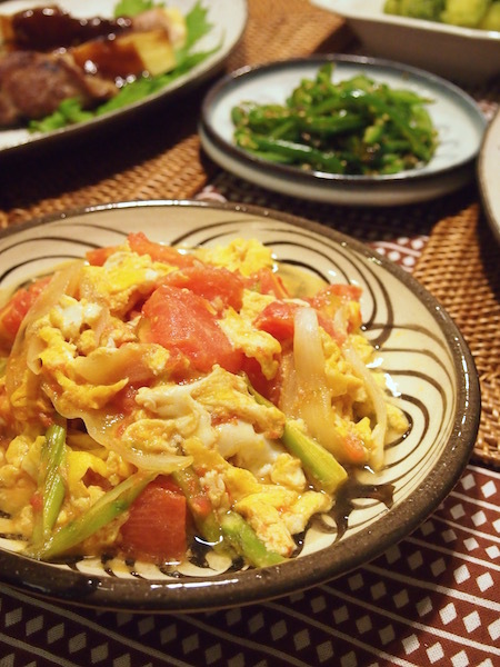 トマト、アスパラガス、玉ねぎの卵とじ