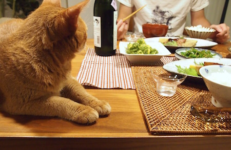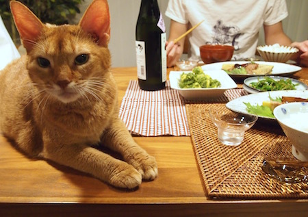 食卓にクロスを敷くと、いち早くスタンバッてます