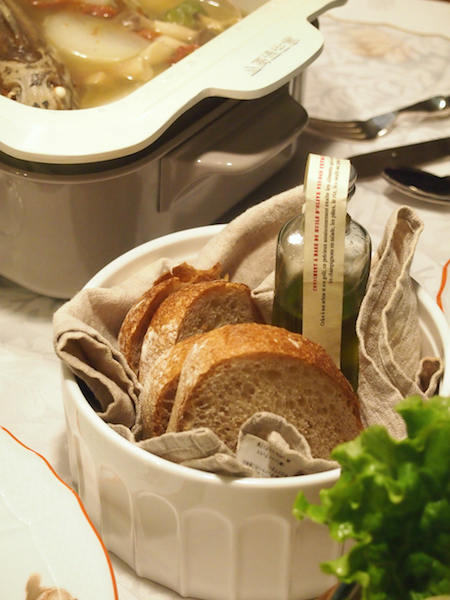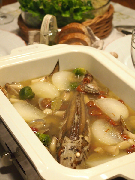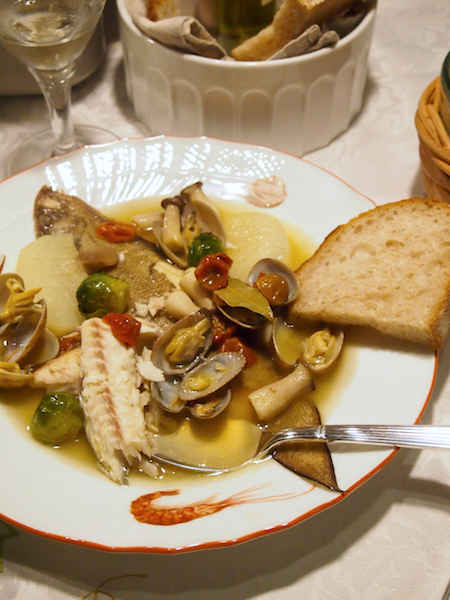 お魚の味の染みたスープをパンにつけて食べたら、最高にワインに合いました