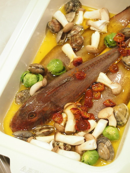 お魚は、前に鳥羽で買って冷凍しておいたホウボウ(200円)と舌平目(2匹で114円)