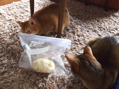 ホットカーペットの上で発酵を促し中。 ニャンズたちも興味津々。