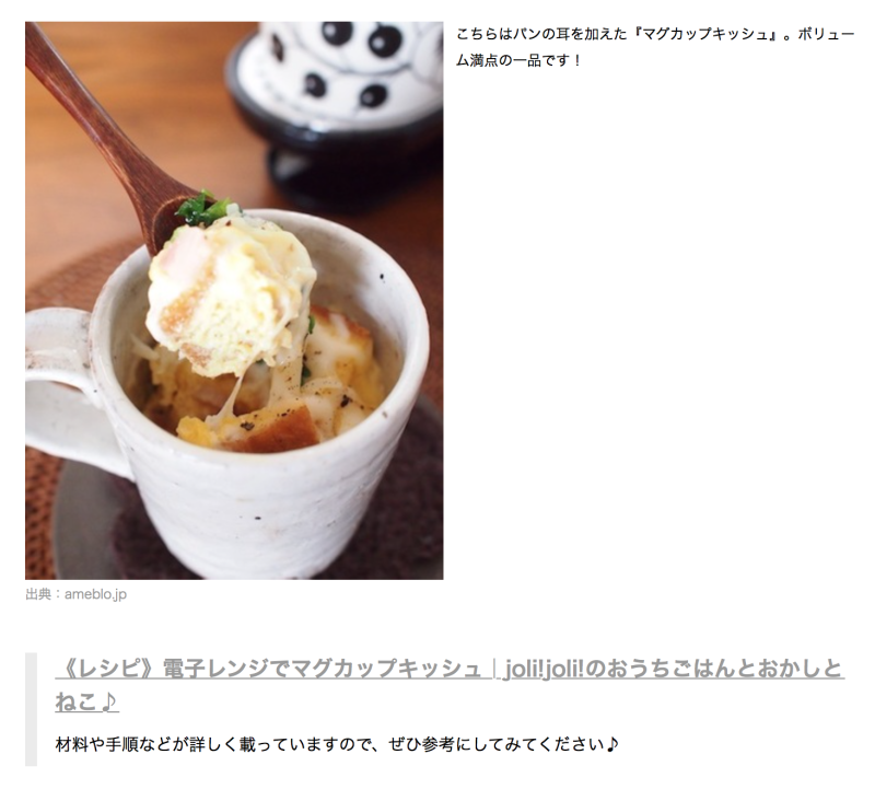 「《レシピ》電子レンジでマグカップキッシュ」が紹介されています