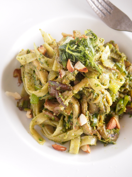 春菊、アーモンド、くるみ、オリーブオイル、にんにくを使ったソースにしてみました