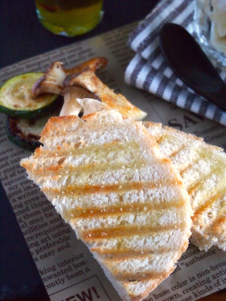 パンには、ニンニクを擦り込んで、オリーブオイルを少しかけました