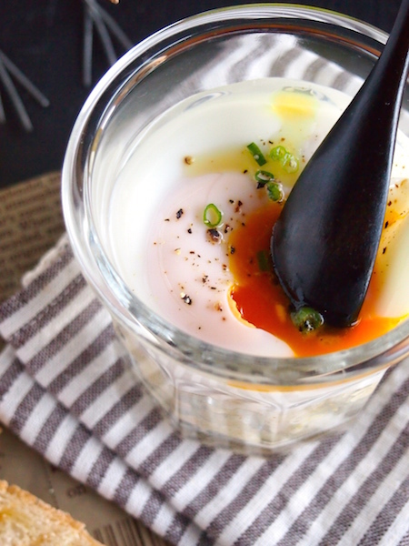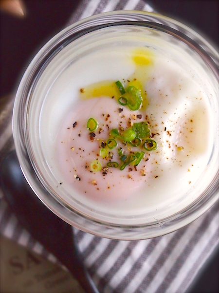 その上に生卵をのせて、湯せんするといういたってシンプルな料理。