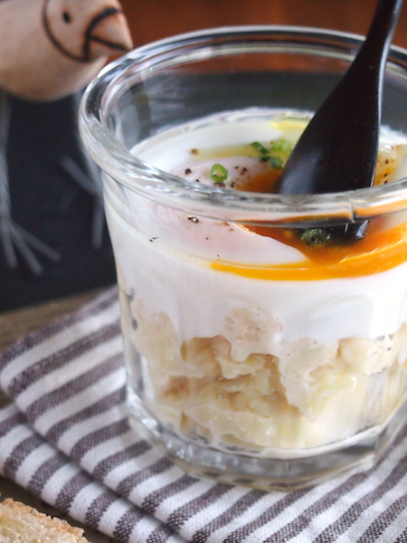 とろとろの半熟状になった卵とふわふわのマッシュポテトを瓶の中でかき混ぜて、