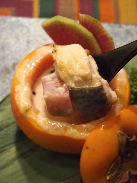 (4)柿の器に、一口大に切ったサワラと炊いた紅芯大根を入れます