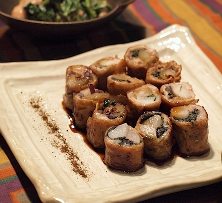 蕪、菊芋、赤色の水菜を豚ロースの薄切りで巻いて、