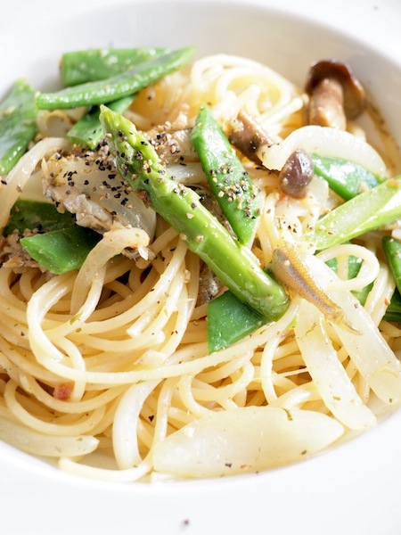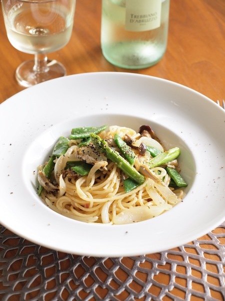 パスタが茹で上がる最後の方に、インゲン豆とアスパラガスを入れてついでに茹でちゃう
