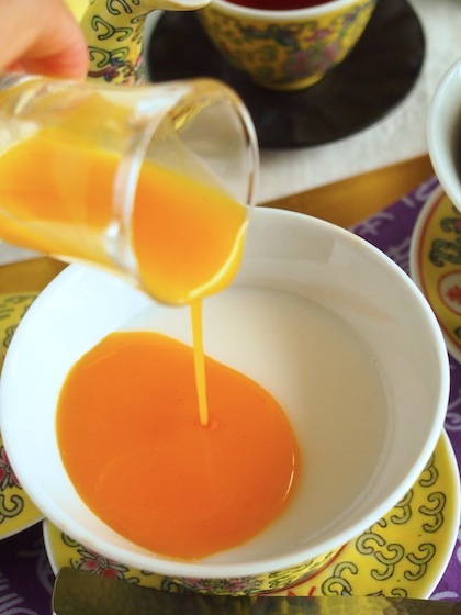 杏仁豆腐に、五香粉入りのマンゴーソースをかけてお召し上がり下さい♪