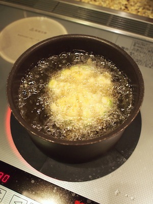⑤ 180℃に熱した油で3~4分、カリッと揚げます
