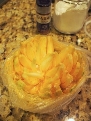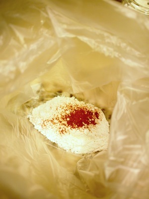 ② ビニール袋に薄力粉(大さじ2)とパプリカ(大さじ1)を入れて