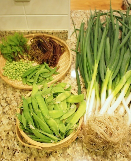 父から、家庭菜園で育てた九条葱とエンドウ豆をたっぷり持たされて