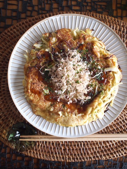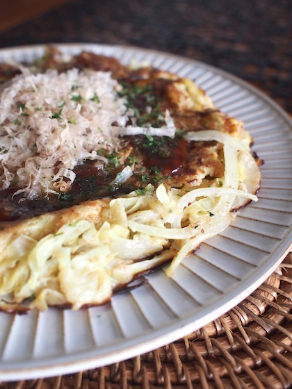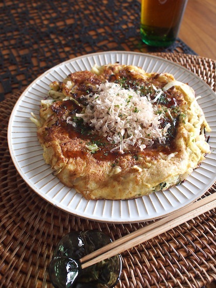 今日のお昼ご飯は、キャベツとタマネギをお好み焼き風にしてみました