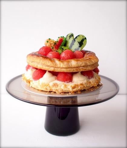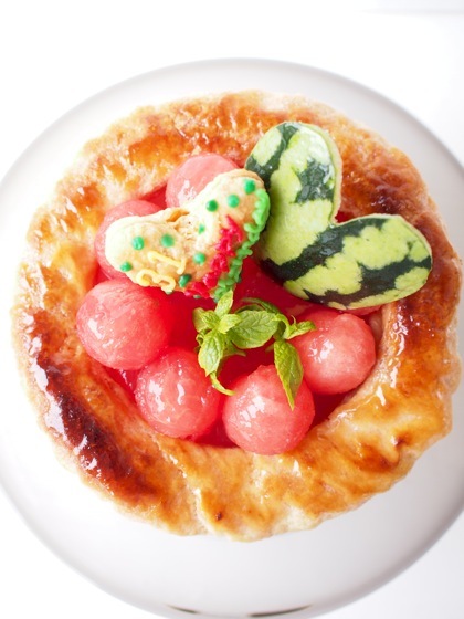 周りに丸く抜いたスイカとクレームレジェールを丸く搾って
