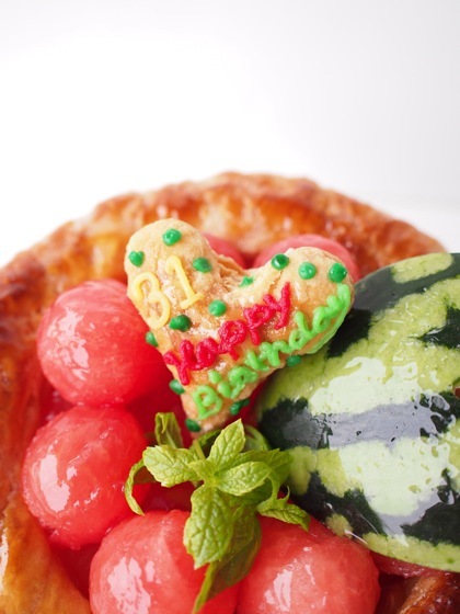 真ん中に丸く抜いたスイカと、スイカの皮で作ったハートなどを飾ってます