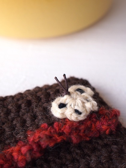 黒い毛糸で模様をつけて、革紐で触角をつけました