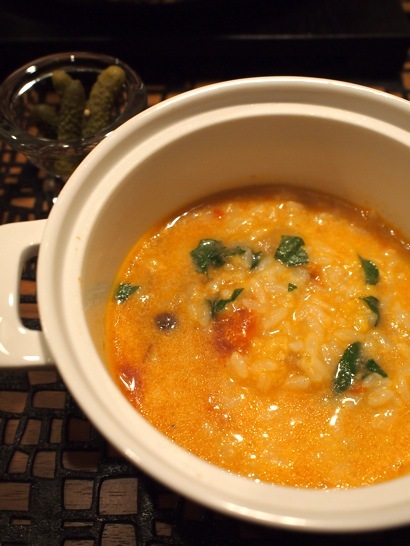 〆に粉チーズとカレー粉とお塩を足して味増しして雑炊に♪