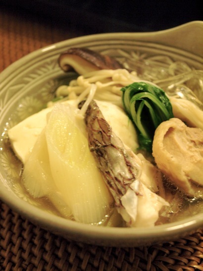 昆布鰹ベースのお出汁にお魚と鶏もも肉が入ってて