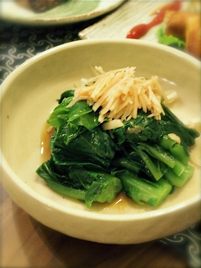 あとは、ツルムラサキを茹でて新生姜とポン酢で