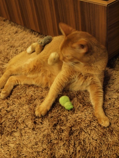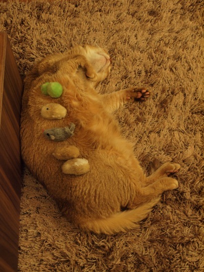 お仕置きに、散らかしてた5匹をお腹に並べてみました