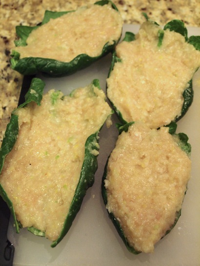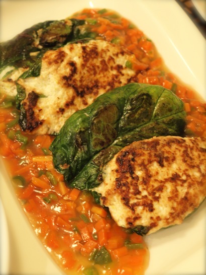 この時期でまわる「ちじみほうれん草」に鶏のつくねを詰めて焼きました