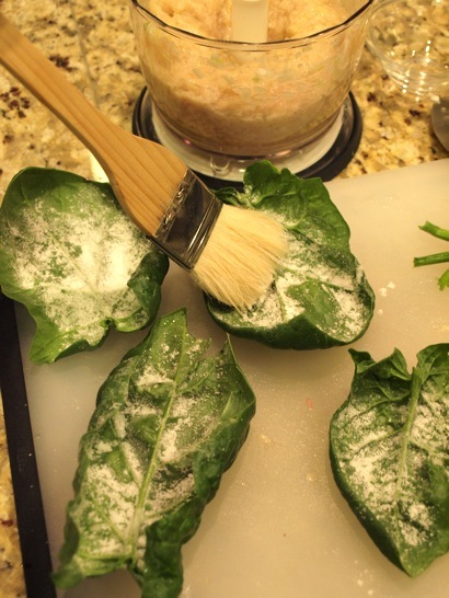 ちじみほうれん草の裏側に刷毛などで片栗粉をはたきます