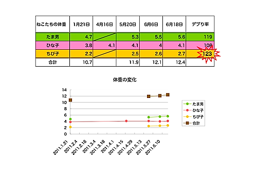 先ほどUPした、にゃんこたちの体重の推移