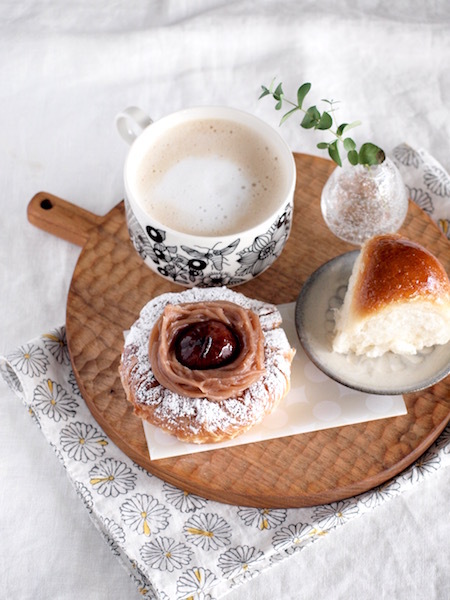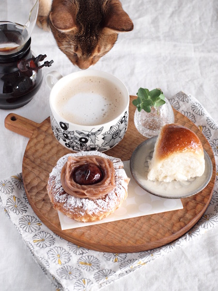 丸のカッティングボードに、お昼のパンを乗っけてみました♪