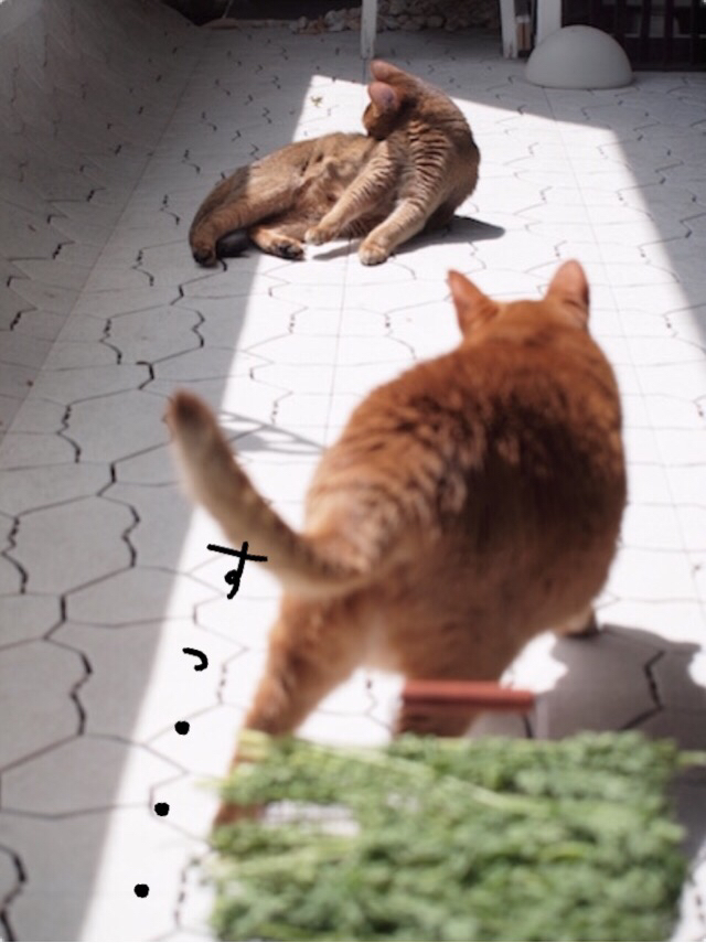 窓を開けたら、ニャンズがウキウキ出てきた♪