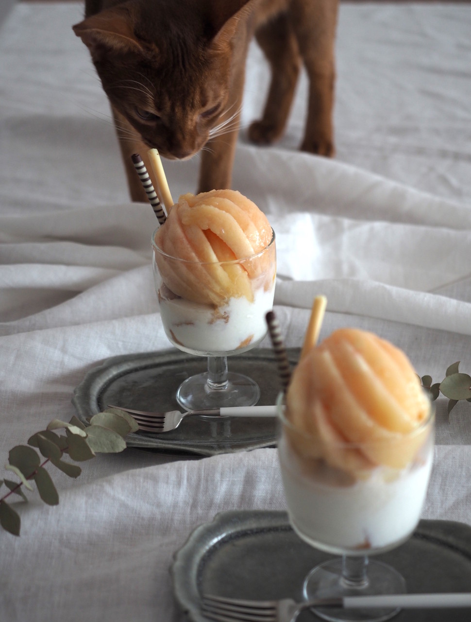 ちびちゃん・ひめちゃん・との君の表情が豊かで可愛くて、じょりじょりさんのスイーツやごはんが美味しそうで桃パフェ参考にさせて頂きます🎶