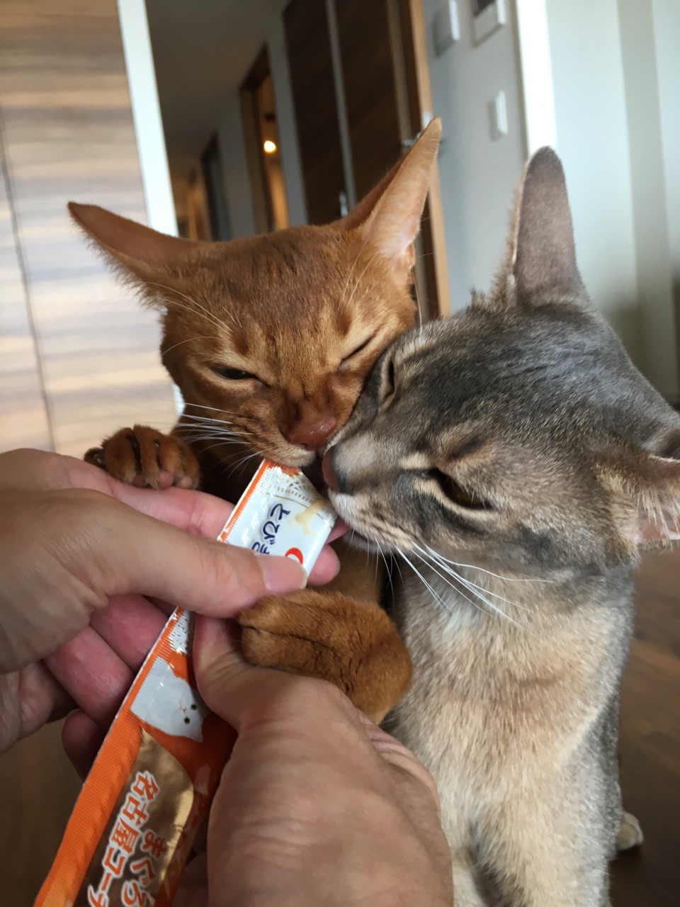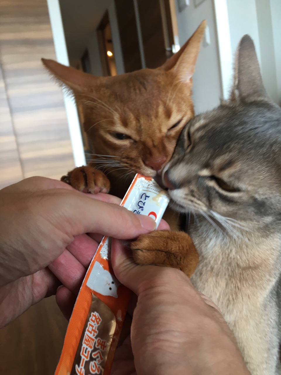 いつも通り、元気にちゅーると向き合うひめちゃんと、横取りされるとの