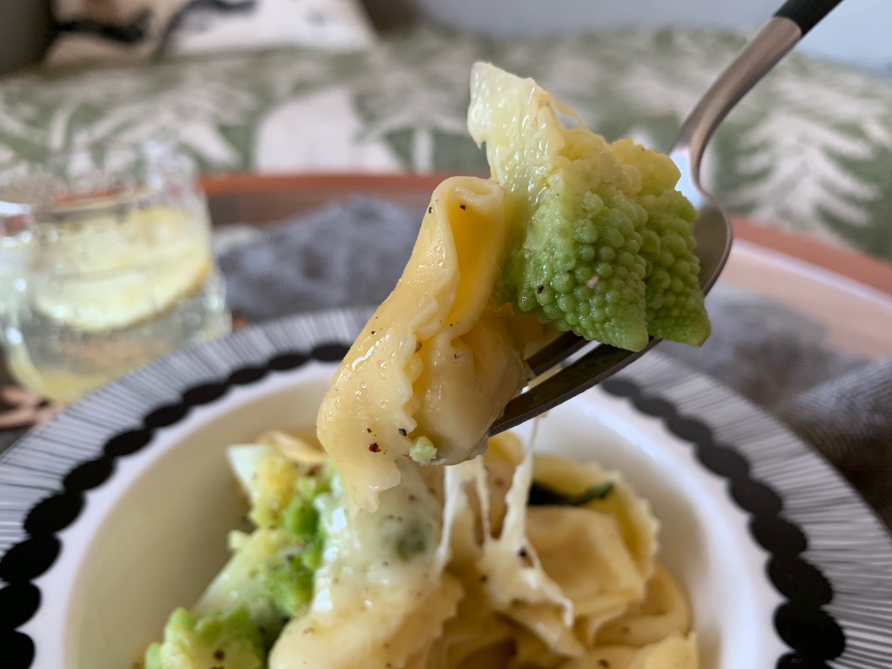 ③茹で上がったロマネスコとチーズトルテローニをザルに揚げて湯を切って、