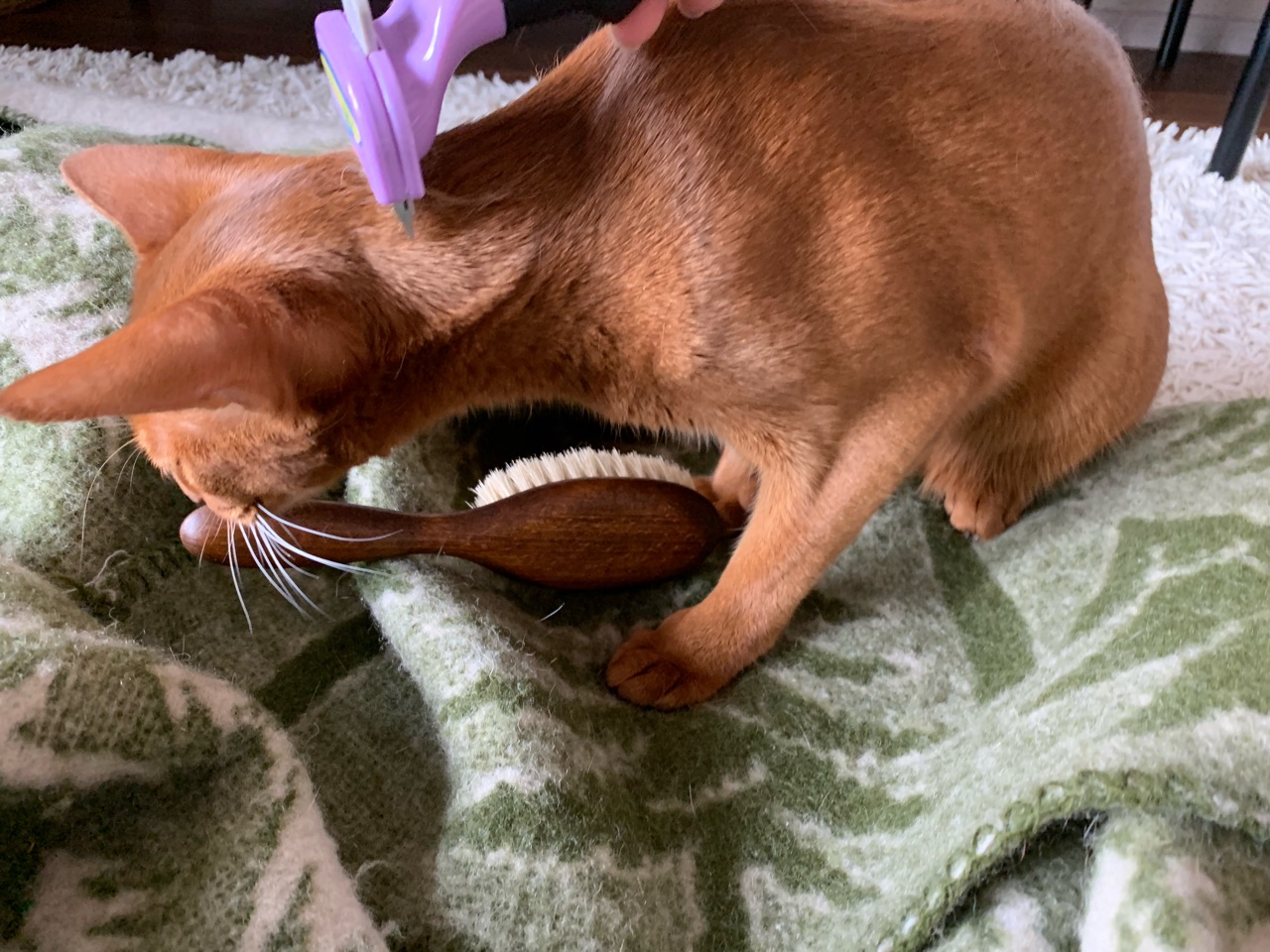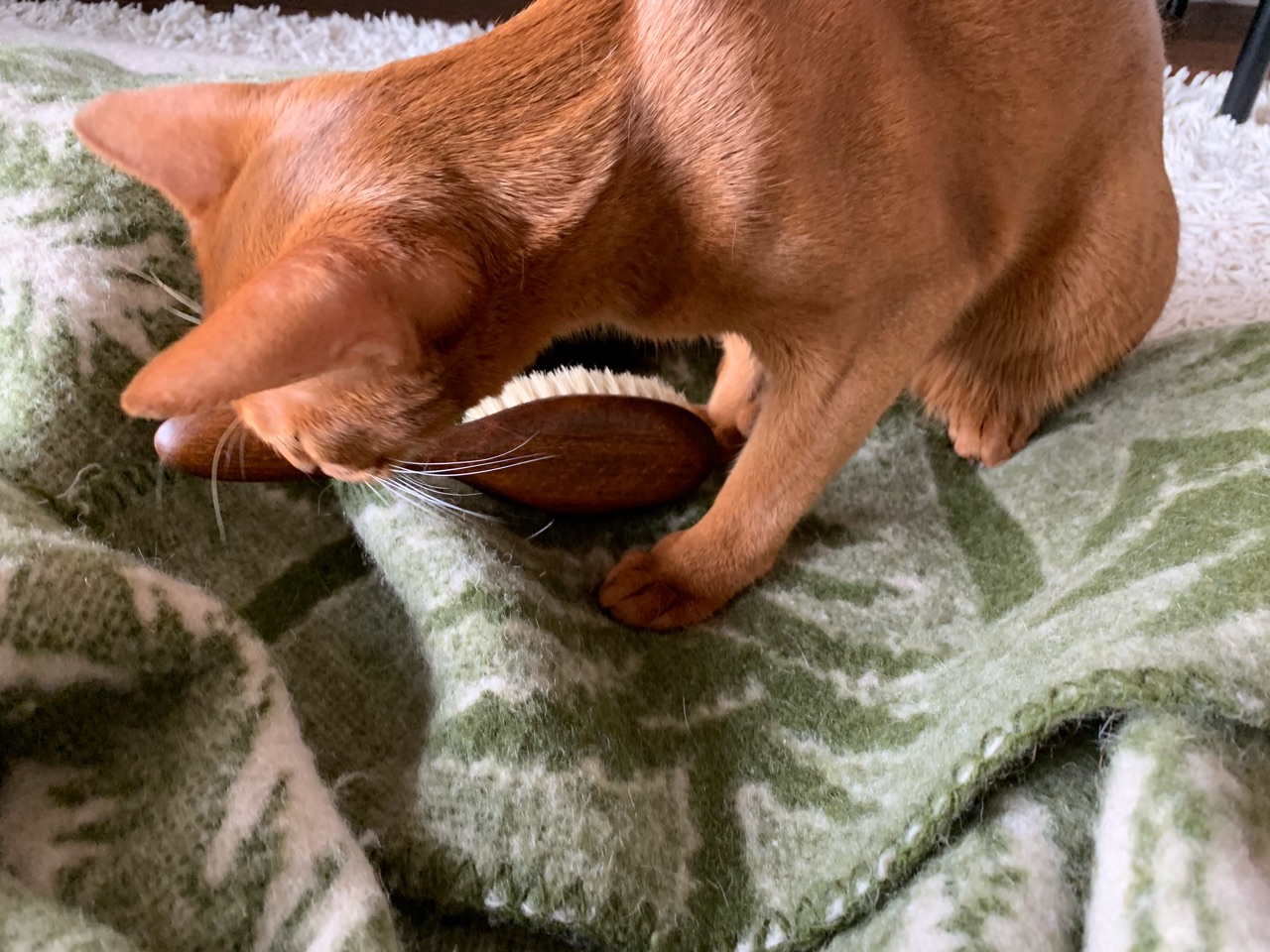 ひめちゃんは、自分でお手入れしたい派なのかな。我が家のにゃんこもファーミネーターでブラッシングされるのが嫌いみたいで、手でバシバシやって拒否します。ごっそり取れますよ~