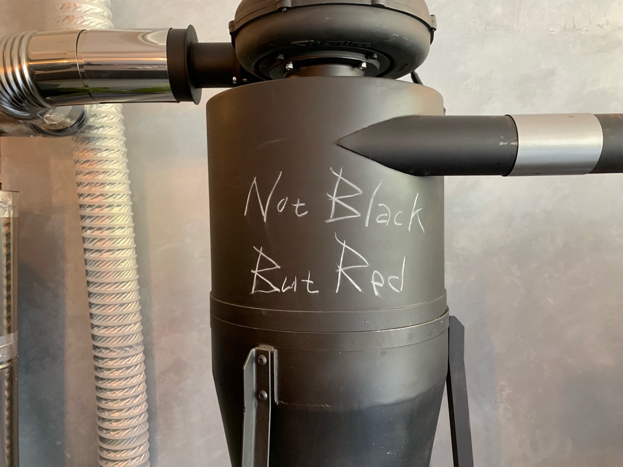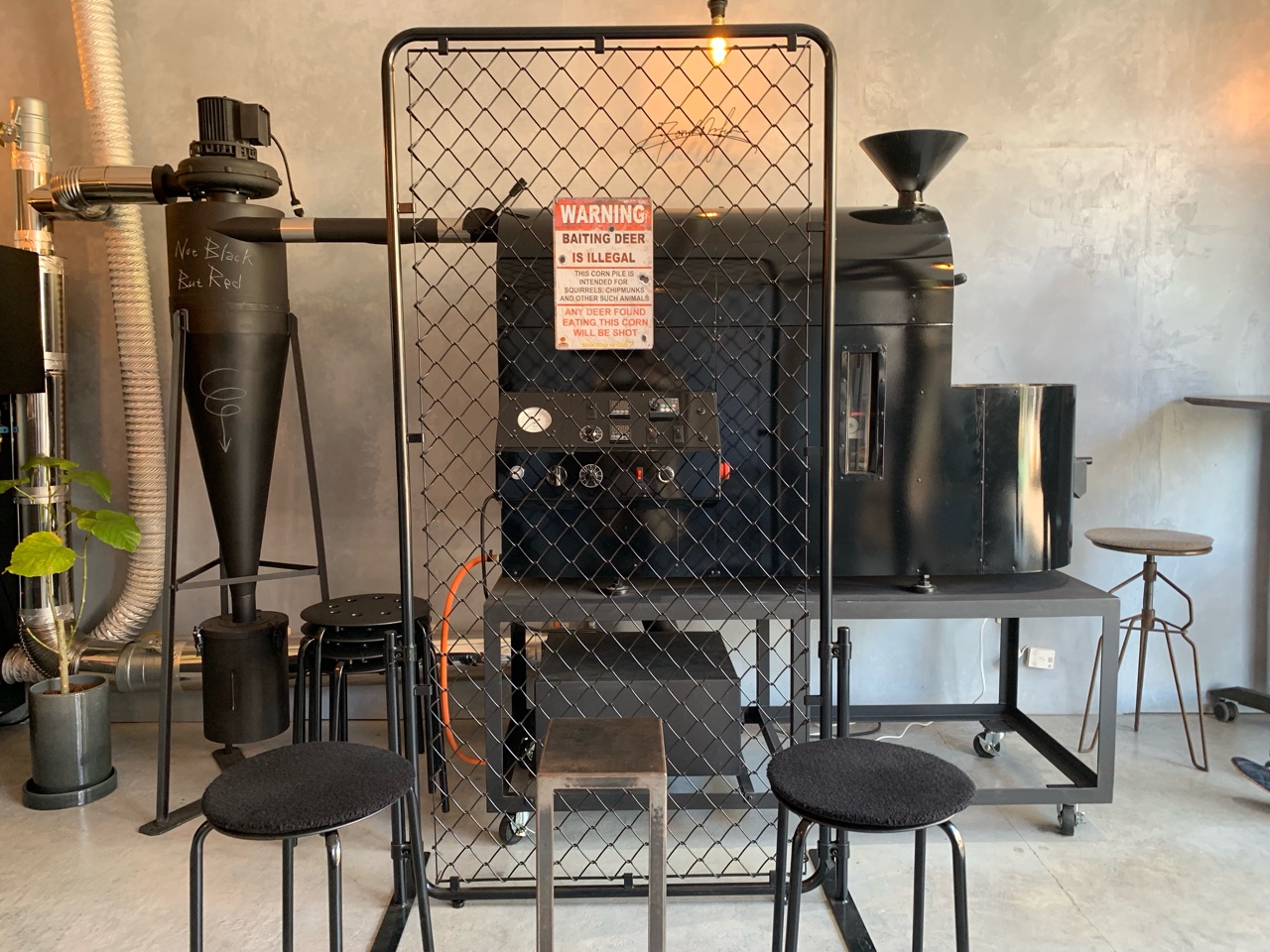 焙煎機に「Not Black But Red」の文字が。