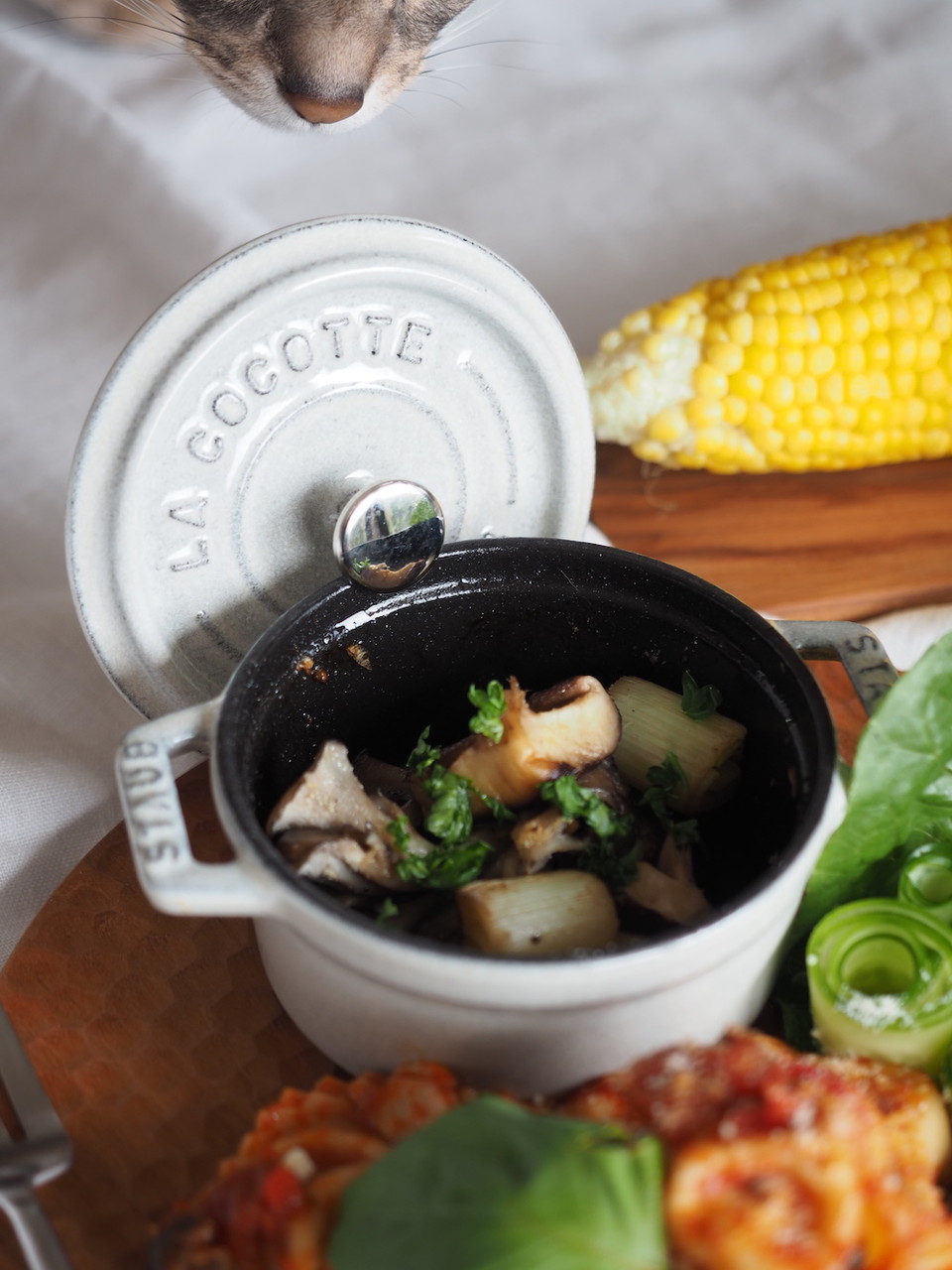 ココットには、キノコのアヒージョを入れてみました。