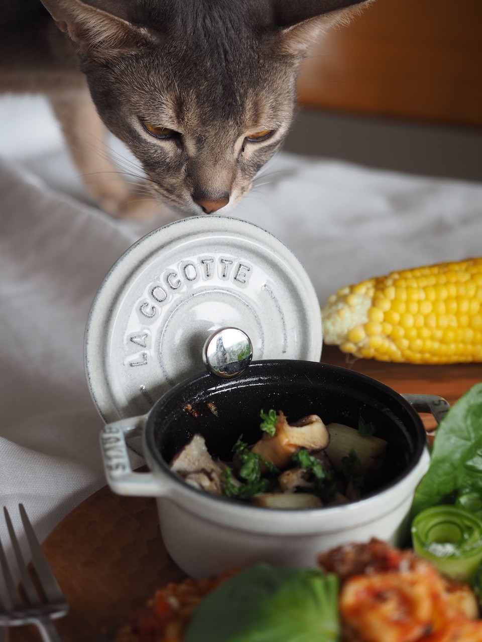 その子は肩乗り猫で、料理中もいつも乗ってましたが、前のめりになって鳥肉を狙ったのはその一回だけです。