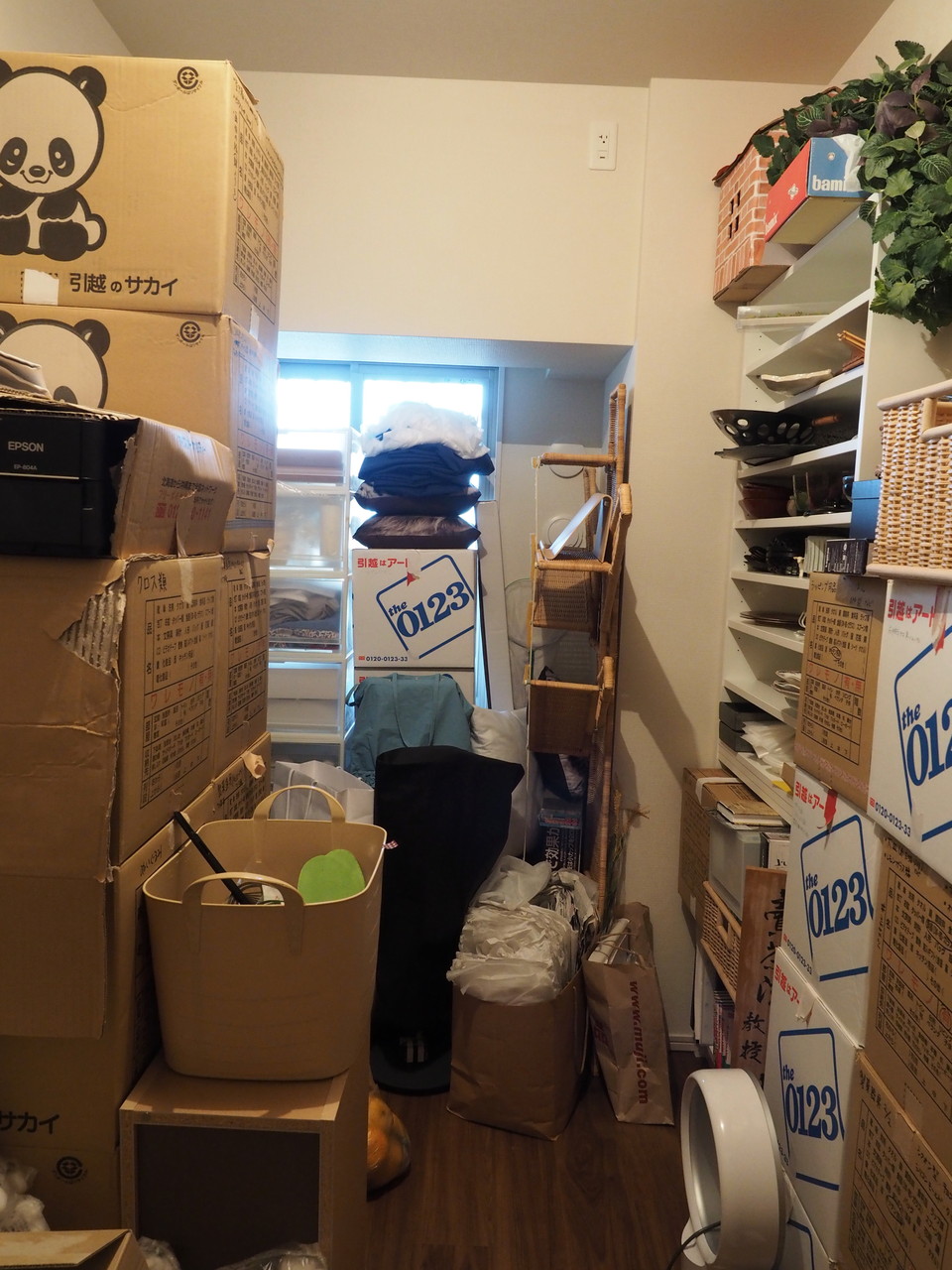 壁全面は、開封できない段ボール(主に器と製菓器具と裁縫道具)が山積みになり、