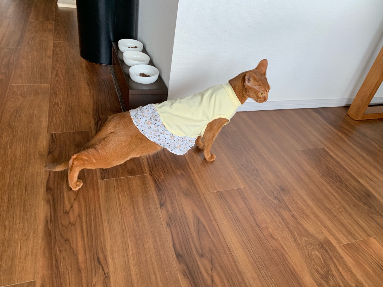 抜け毛予防のお洋服は何度か着せてますが、軽い素材で身体にぴったりフィットするタイプなら割と平気で脱いだりしません。ひめちゃんのお洋服もちょっと大きくて身体に合ってないのかも?