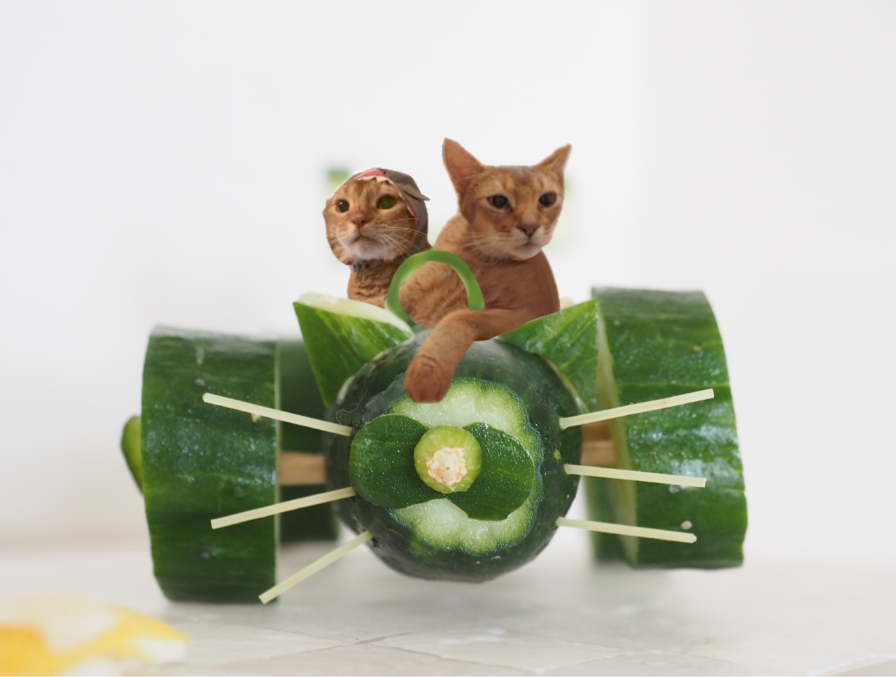 この方の真似をして作って、2人乗りにして、フロントに猫の顔を付けました