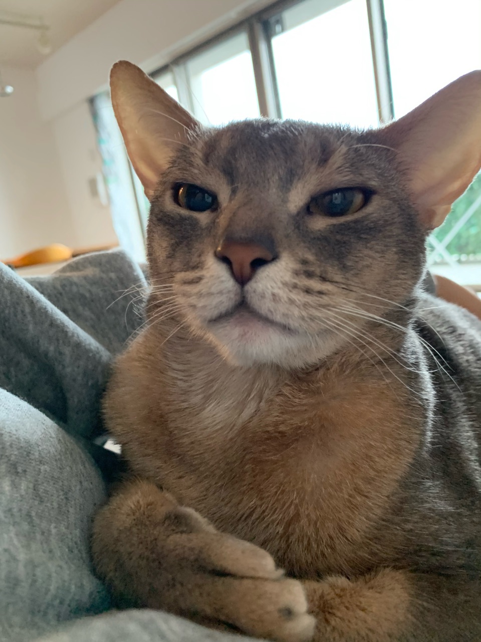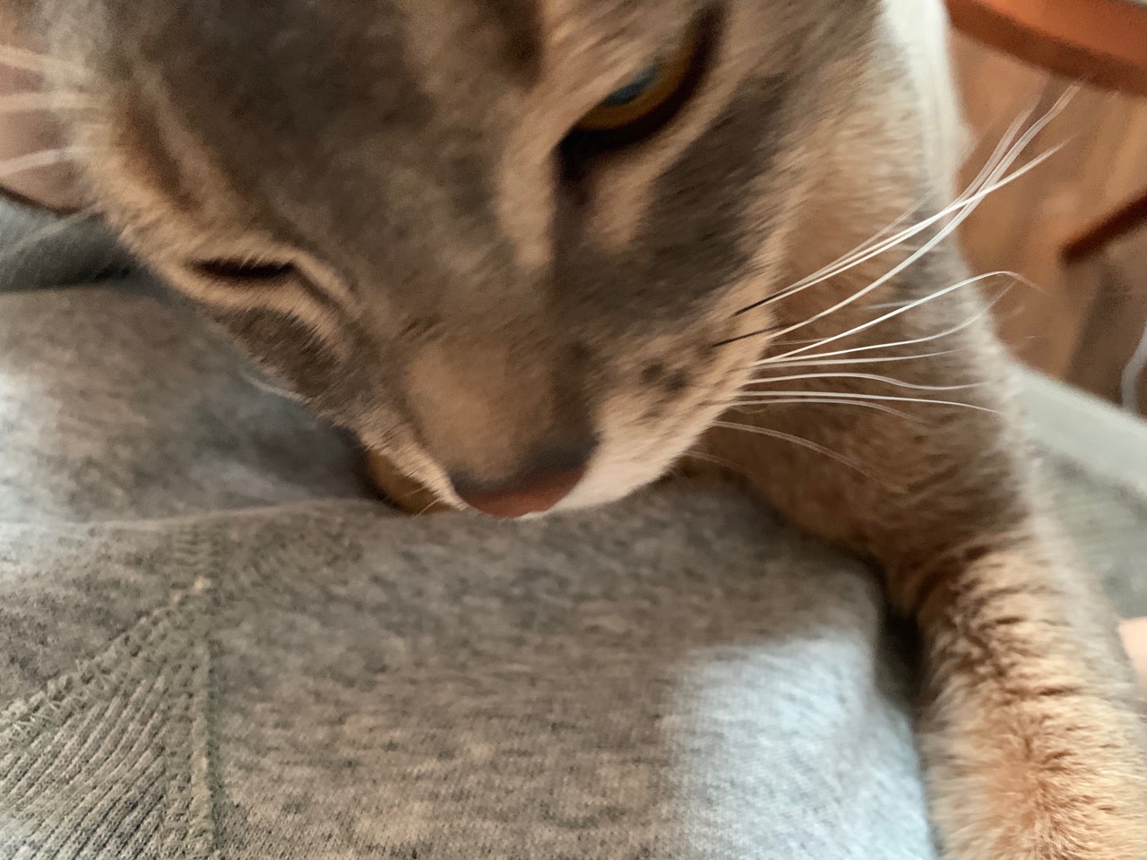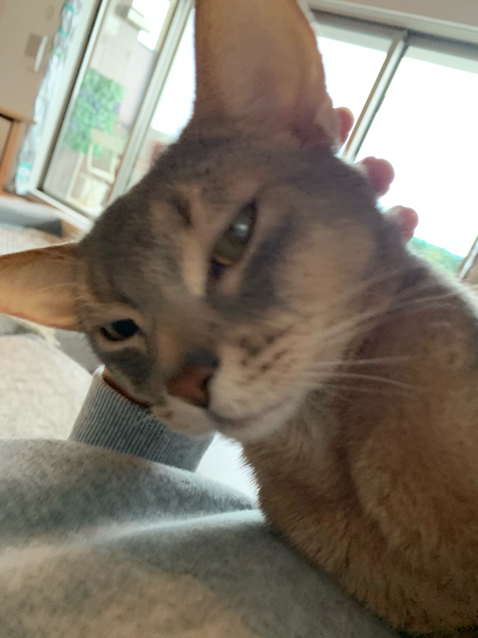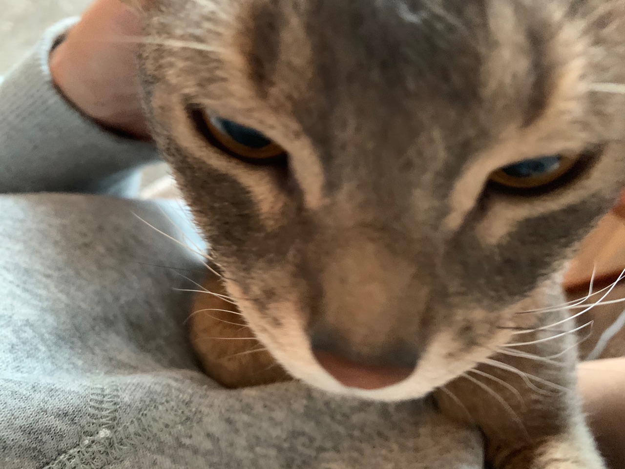ゴロゴロ言いながらこっちを見て、頭を右に左に揺らして甘えてる様子です。