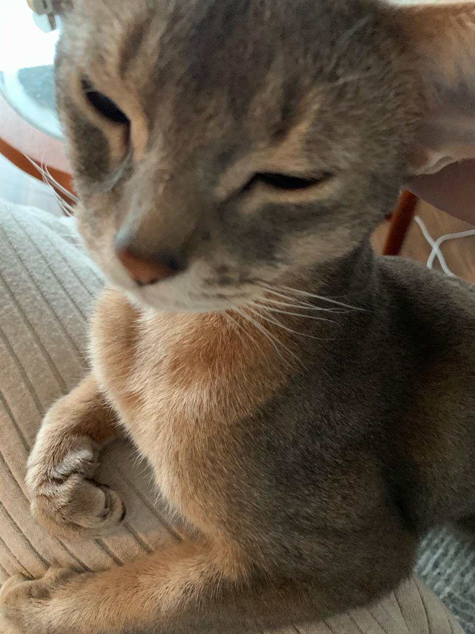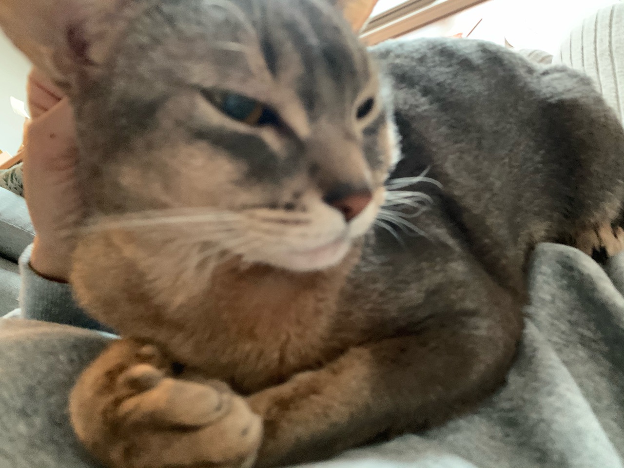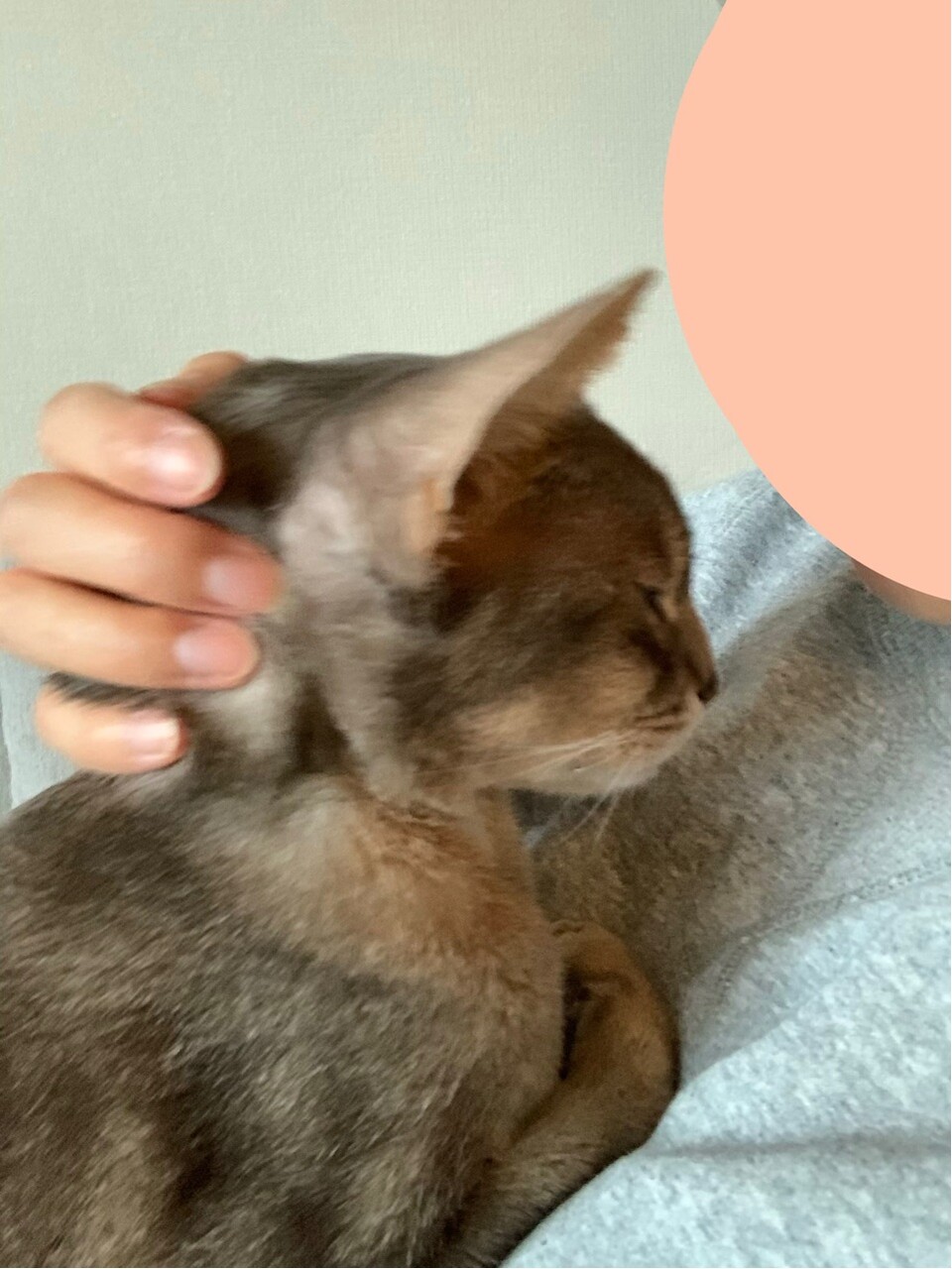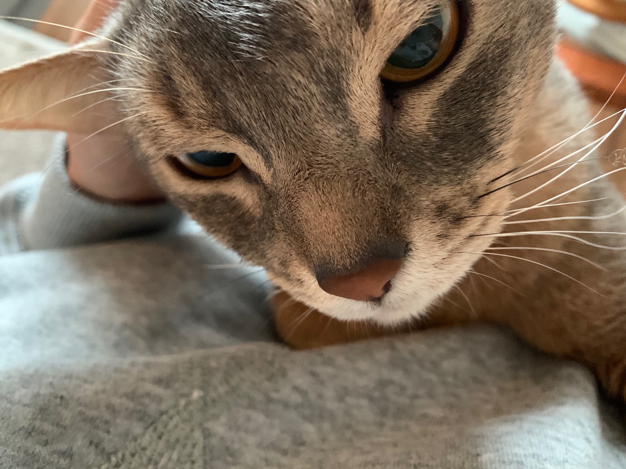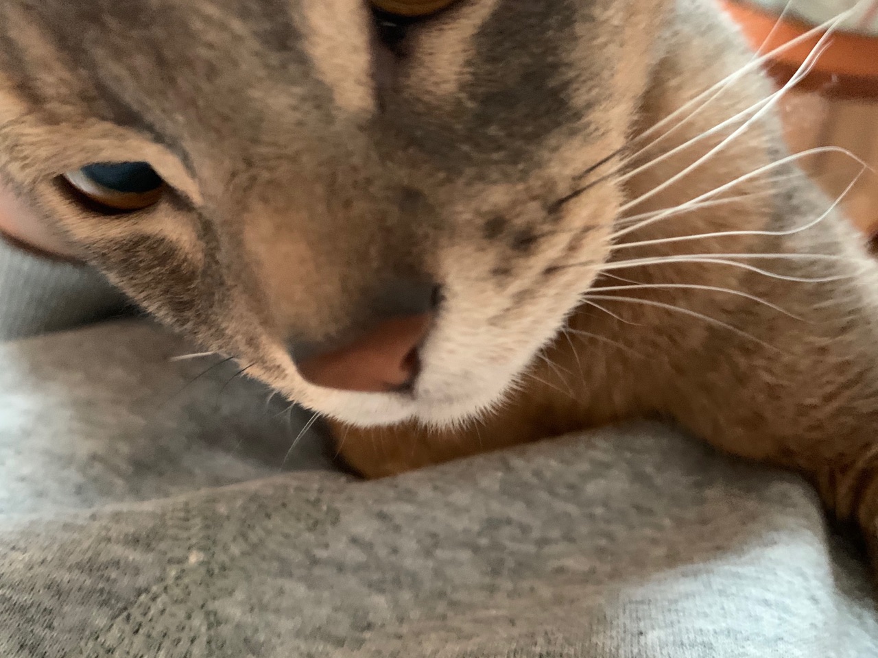 ゴロゴロ言いながらこっちを見て、頭を右に左に揺らして甘えてる様子です。