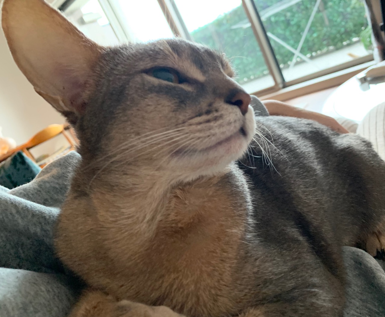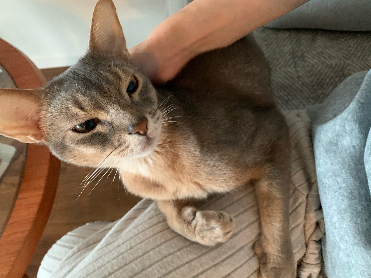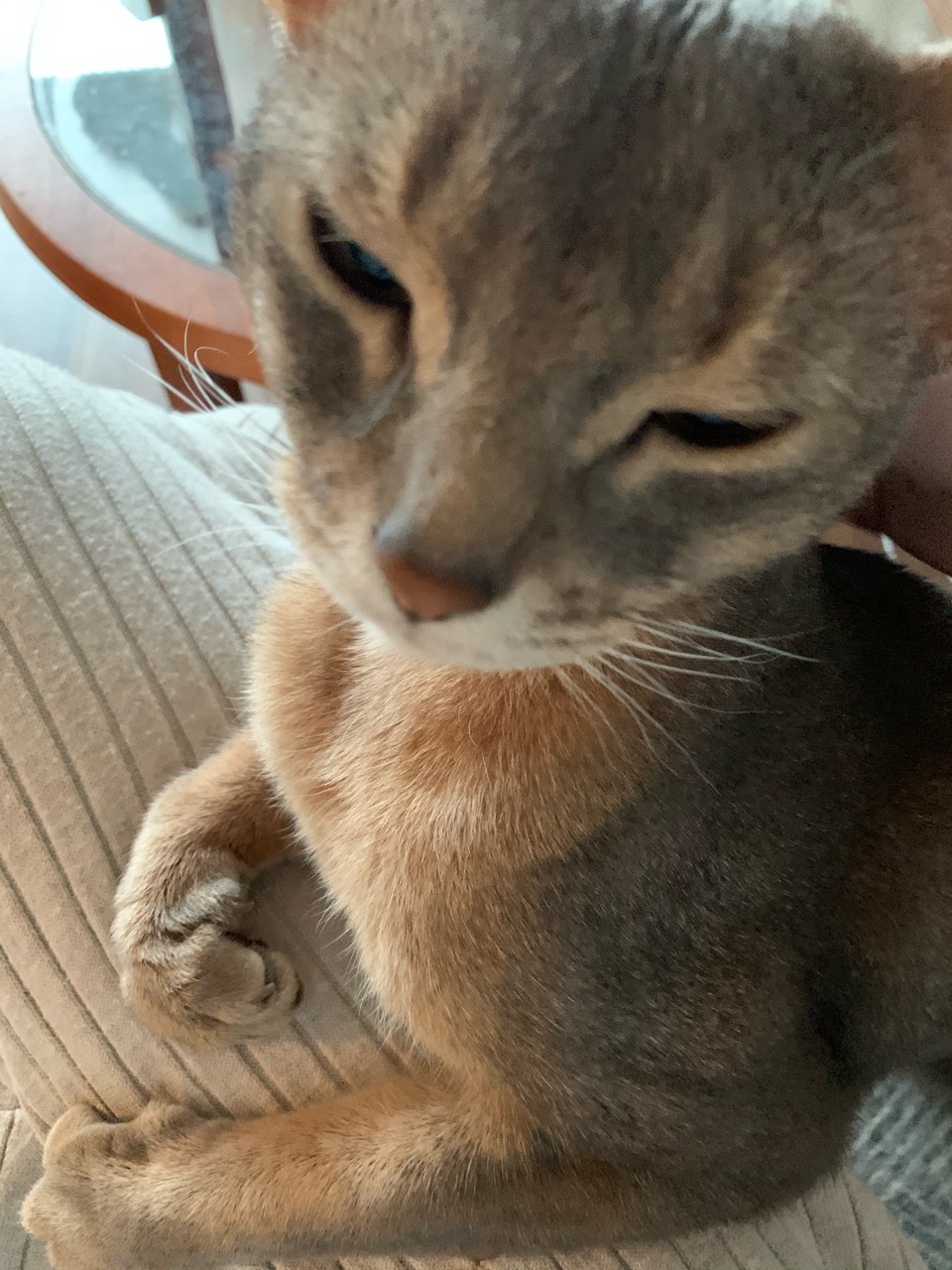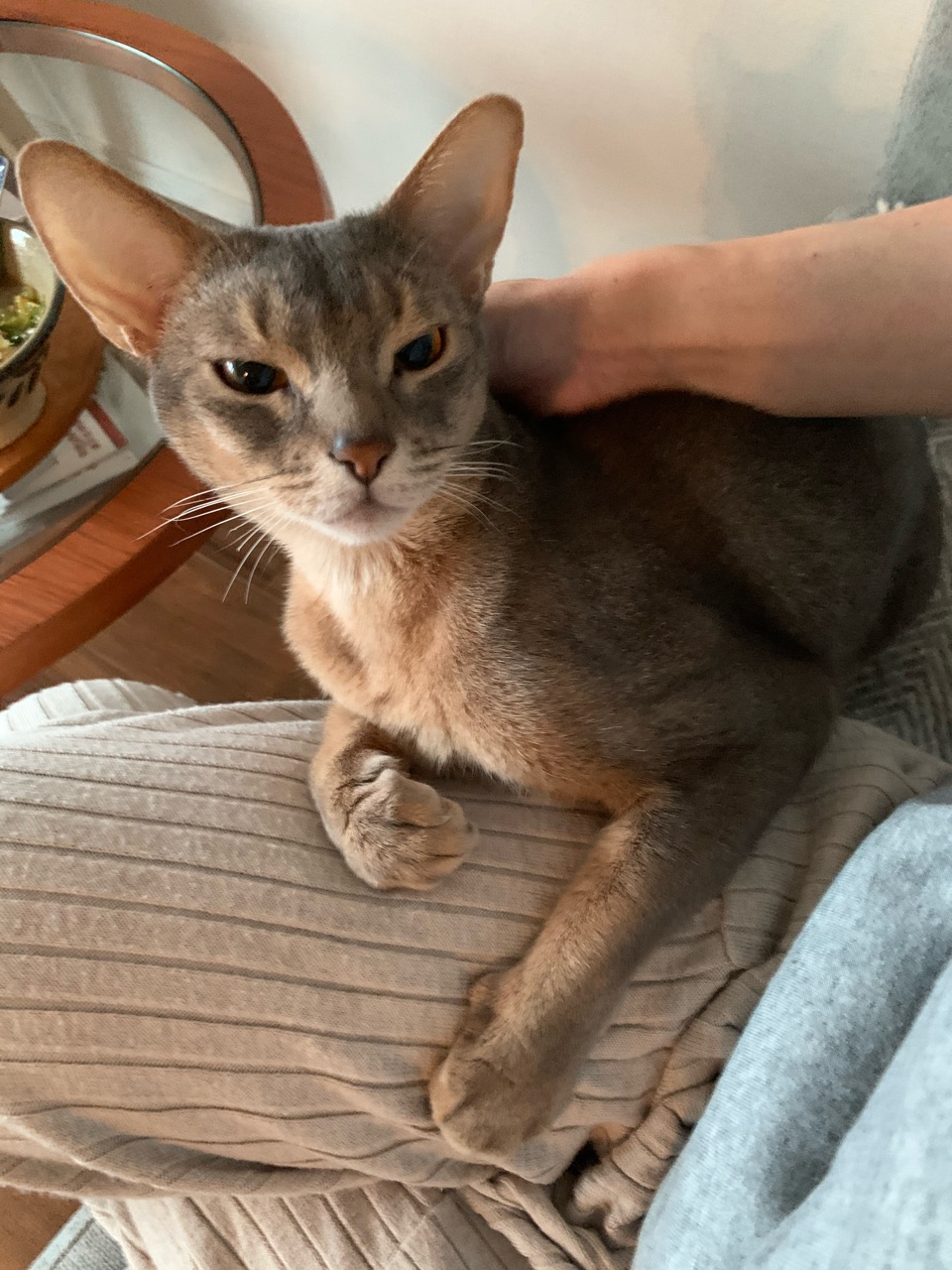 ゴロゴロ言いながらこっちを見て、頭を右に左に揺らして甘えてる様子です。