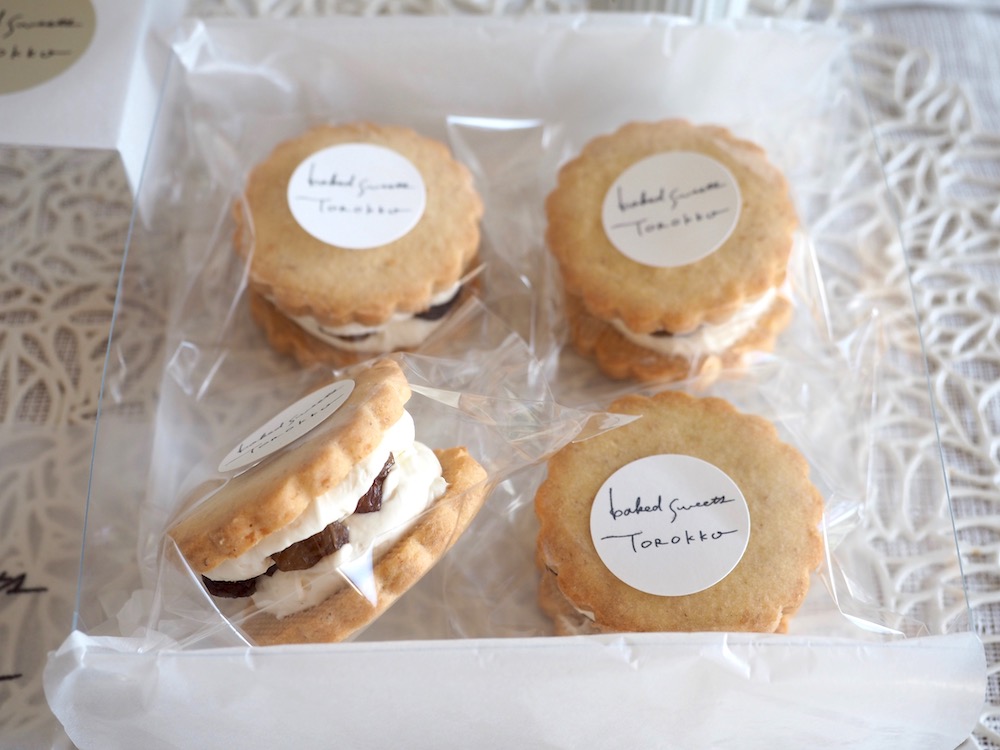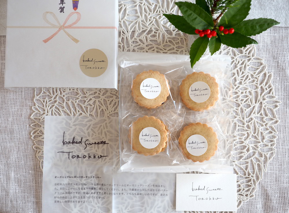綺麗に並んだバターサンドと、薄紙にプリントされた商品紹介が素敵です