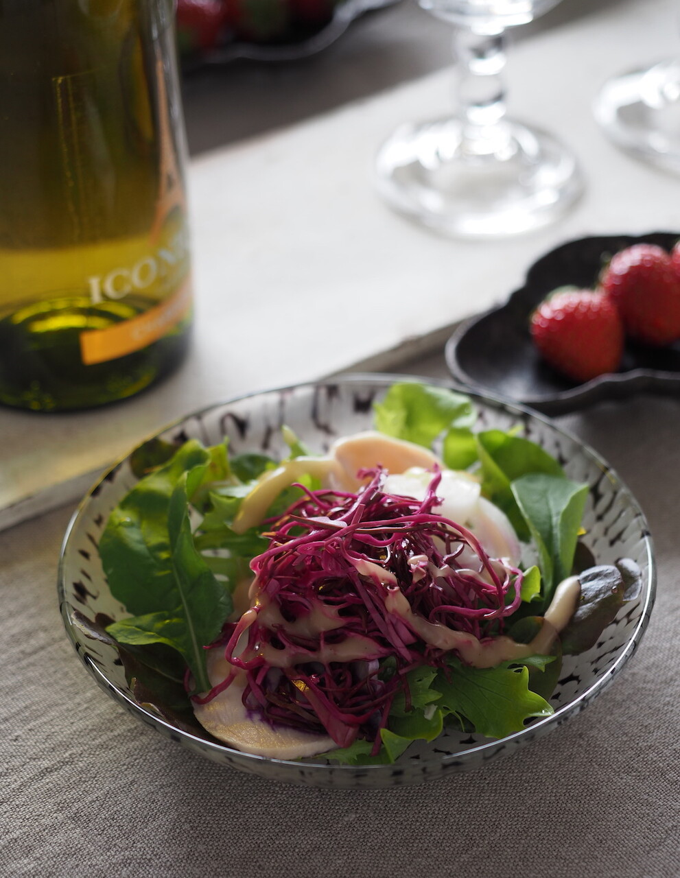 レタスと、作り置きの玉ねぎピクルスと紫キャベツの酢漬け。