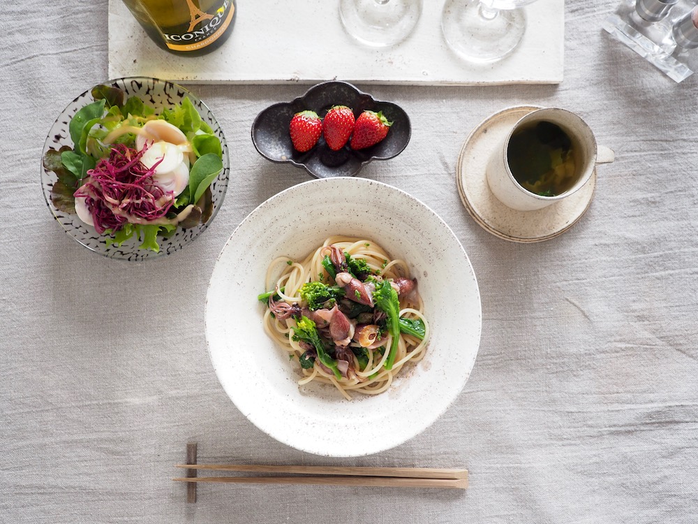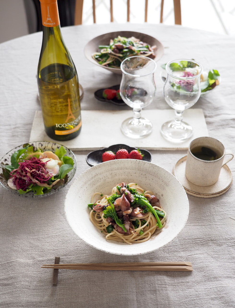 パスタは、二階堂明弘さんの器に盛り付けてお箸でいただきました。